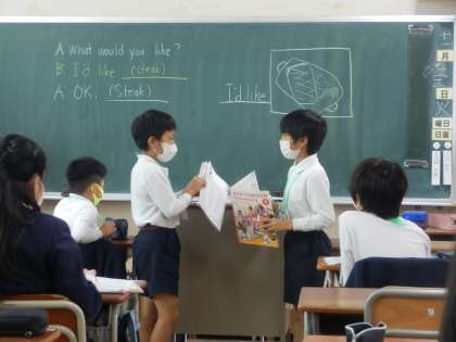 今日の学習は、What would you like?で、食べたい料理を決めて、友だちとペアで注文したり受けたりする学習でした。積極的に参加できました。