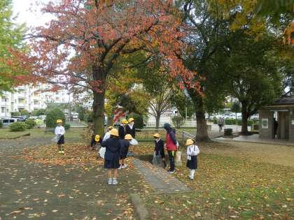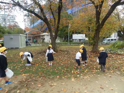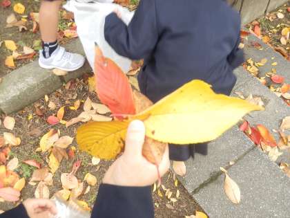 1年生が毛馬中央公園へ秋見つけに行きました。きれいな葉っぱをたくさん拾いました。「みてみて!鳥みたい!」「キツネができたよ!」と想像力を膨らませていました。これからの活動が楽しみです。
