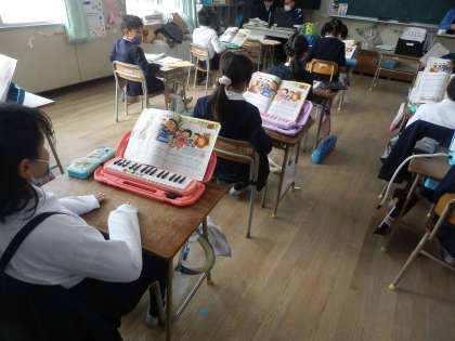 2年生の音楽では、「村まつり」という曲の学習をしました。DVDも鑑賞し大きな太鼓をたたく祭りの様子を観ました。祭りの音楽に合わせて、子どもたちは、体が自然と踊りだしそうでした。