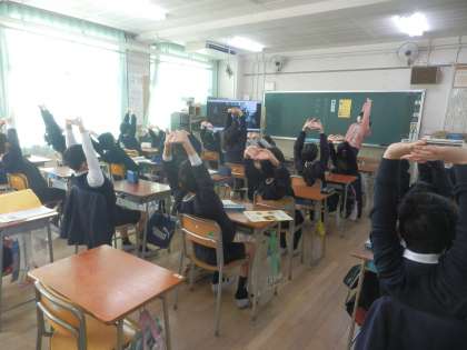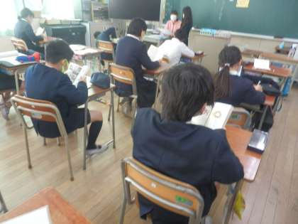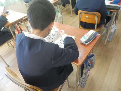 水曜日の朝は全クラス読書タイムです。みんな好きな本を集中して読んでいます。その後は、動画を観ながら姿勢体操をしてから学習に入ります。