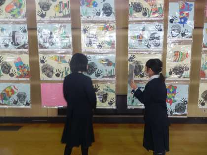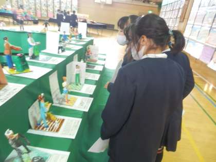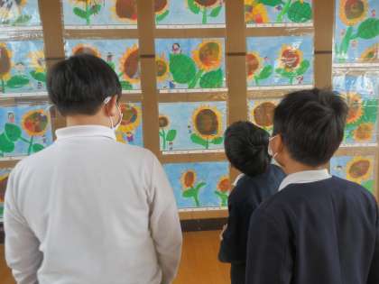 4年生が講堂の作品展を鑑賞していました。各学年の工夫している点を見つけてまとめていました。ほかの学年の作品をしっかり観察できました。