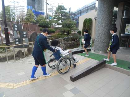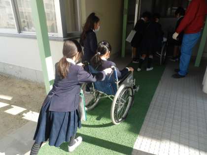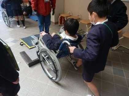 その後、校舎内を車いすに乗ってグループでまわってみました。普段気付かなかった小さな段差や坂道も、車いすに人を乗せてまわるのは大変なことがわかりました。交代しながら、全員が体験することができました。