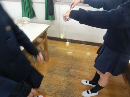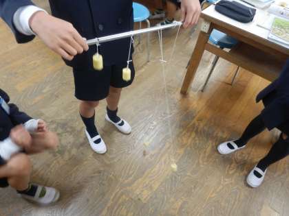 振り子のひもの長さを変えて、一つだけ振り子を動かす実験です。微妙な力加減で1つだけ振り子が動きます。