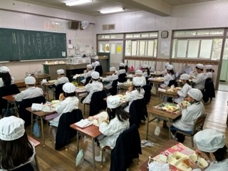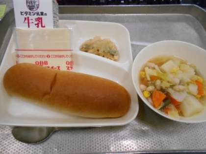 今日の給食は、黒糖パン、牛乳、あじのレモンマリネ、てぼ豆のスープ煮、スライスチーズです。あじには血液や筋肉をつくるたんぱく質、ほねや歯をじょうぶにするカルシウムのほか、ビタミンなども含まれています。脂質には、脳の働きを活発にするDHA(ドコサヘキサエン酸)や、血液をサラサラにするEPA(エイコサペンタエン酸)も多く含まれています。