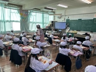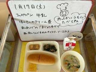 今日の給食は、コッペパン、牛乳、はくさいのクリーム煮、あつあげのごまじょうゆかげ、豚肉とさんどまめのオイスターソースいため、マーマレードです。毎日飲んでいる牛乳には、タンパク質やカルシウムがたくさん含まれているほか、脂質や糖質、ビタミンなども含まれています。カルシウムには、ほねや歯を丈夫にする働きがあります。
