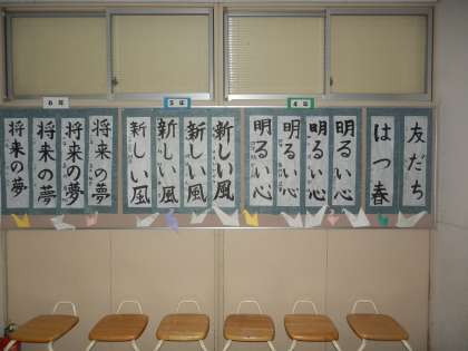 ピロティ—には、各学年の書初めが掲示されています。どれもしっかりと書くことができています。