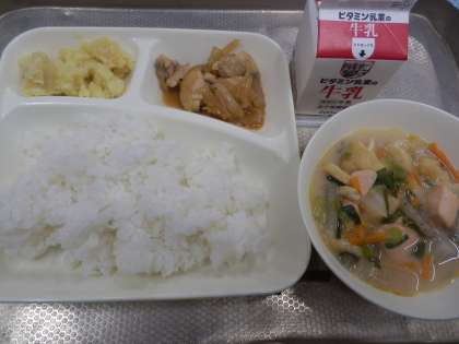 今日の給食は、鶏肉の甘辛焼き、かす汁、くりきんとん、ごはん、牛乳です。くりきんとんの作り方は、まず、さつまいもを、水にさらしてあくをぬきます。くり(水煮缶)は液汁を十分に切ります。次に、湯をわかし、さつまいも、くりの順に加えて煮る。最後に、煮あがれば、砂糖、みりん、塩で味付けをして煮含めます。