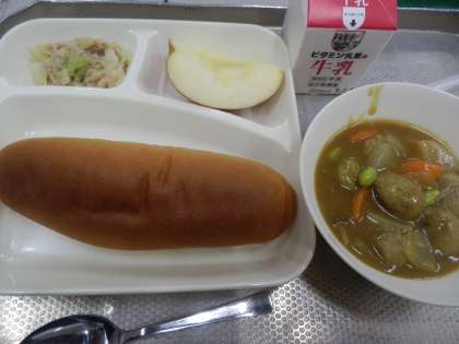今日の給食は、黒糖パン、牛乳、ミートボールと野菜のカレー煮、ツナとキャベツのソテー、りんごです。寒さに負けないじょうぶな体をつくるために、栄養のバランスがよい食事をしましょう。バランスのよい食事とは、赤・黄・緑のグループをバランスよくとることが大事です。