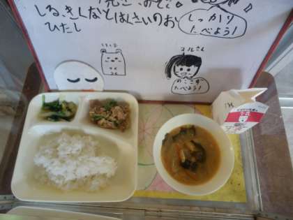 今日の給食は、豚肉のごまだれ焼き、きくなとはくさいのおひたし、みそ汁、ご飯、牛乳です。きくなは、春に黄色の花を咲かせるので「春菊」とも呼ばれます。10月〜3月が旬(1番おいしい時期)の野菜です。