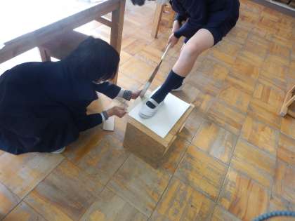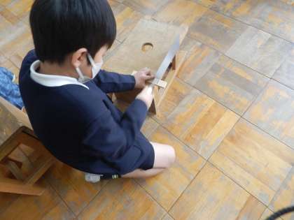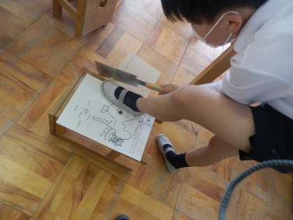4年生の図工では、「ギコギコとんとんクリエイター」を行いました。のこぎりや金づちを使っていろいろなものを作ります。今日は、正しいのこぎりの使い方の学習をしたあと、実際に板を切ってみました。友だちと協力して作業する姿も見られました。