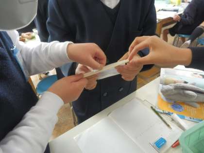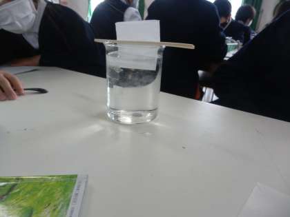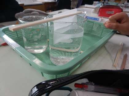 5年生の理科では、ものの溶け方の学習です。今日は、塩、さとう、食紅を水に溶ける様子を観察しました。