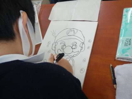 「くぎうちビー玉ゲーム」の製作中です。今日は、板にデザインをうつして、色づけをしました。板いっぱいにデザインをうつすことができました。