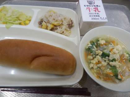 今日の給食は、黒糖パン、牛乳、中華おこわ、卵スープ、キャベツのオイスターソースいためです。塩分をとりすぎないように、大阪市の給食では、以下のような工夫をしています。