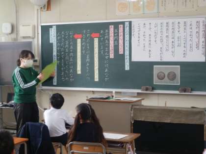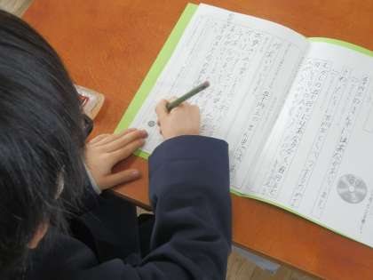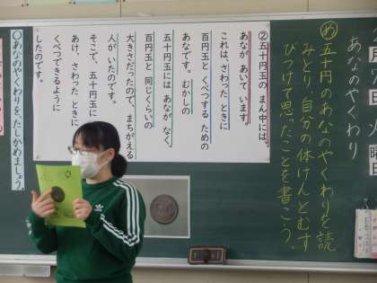 「あなのやくわり」の学習です。今日は、五十円玉の穴の役割を読み取って自分の体験と結び付けて思ったことを書く学習です。