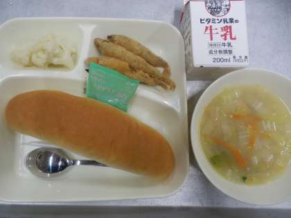 今日の給食は、わかさぎフライ、コーンとはくさいのスープ、カリフラワーのサラダ、コッペパン、牛乳です。わかさぎは、海で成長して卵を産む時期に川をのぼってくるものと、湖に住んでいるものに分かれています。天ぷらやフライが代表的な料理で、骨がやわらかく丸ごと食べることができる魚です。