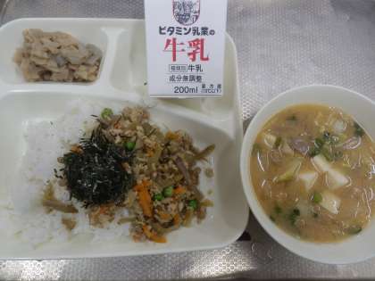今日の給食は、鶏ごぼうごはん、焼きれんこん、とうふのみそ汁、牛乳です。れんこんは、どろの中を伸びた地下のくきが大きくなったものです。かぜを防ぐビタミンCやおなかの調子を整える食物せんいなどが多く含まれています。