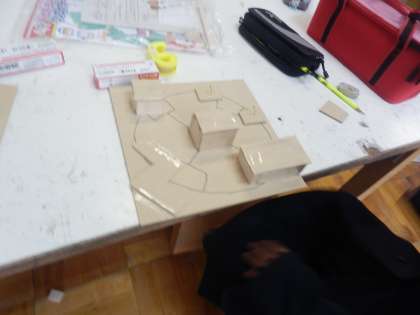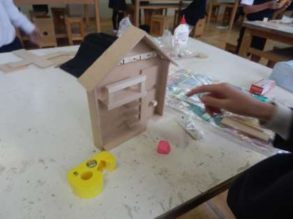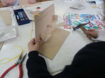 「ギコギコとんとんクリエイター」を製作中です。のこぎりや金づちを上手に使って作っています。一枚の木の板が少しずつ形になってきました。