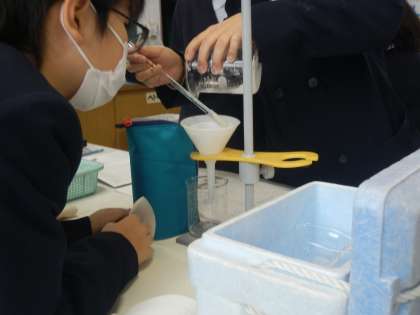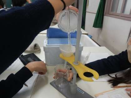 今日の学習は、「水溶液を冷やすと溶けているものを取り出せるだろうか?」という学習課題でした。ろ紙とろうとを使ってこす(ろ過)の方法を学びました。ガラス棒を使ってろ過することができました。