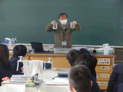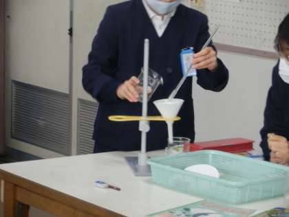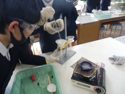 5年生の理科では、「ものの溶け方」の学習をしています。今日は、ミョウバンと食塩水の水溶液の水に溶けているものを取り出す学習です。