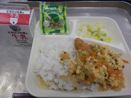 今日の給食は、カツ丼、はくさいの甘酢あえ、抹茶大豆、牛乳です。抹茶大豆は、いり大豆に香りのよい抹茶とほのかな甘さが特徴であるきびとうをからめて作られています。抹茶は、てん茶というお茶の葉を石うすで粉にしたもので、きびとうは、さとうきびから作る茶色のさとうです。