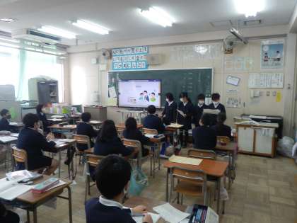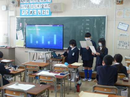 「調べたことをほうこくしよう」の学習です。休日の過ごし方や家の手伝いなど、気になったことをアンケートをとり、それをまとめ、発表しました。発表はPowerPointを使って上手に発表することができました。