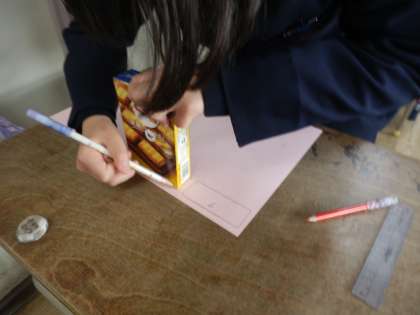 2年生の算数の時間では、はこの形の面の形や面の数を調べる学習をしました。箱の面を紙に写し取って調べます。