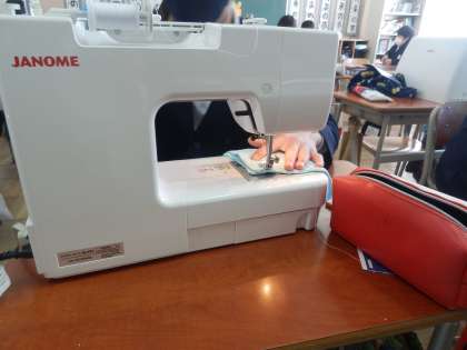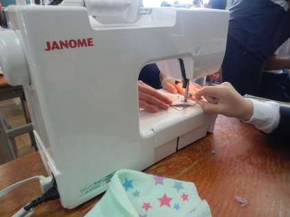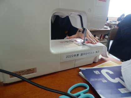 在校生へのプレゼント(ぞうきん)を手縫いとミシンを使って製作しています。心を込めて作っています。