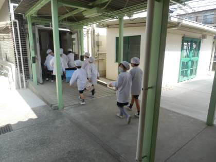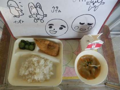 今日の給食は、いわしフライ、みそ汁、きゅうりの赤じそあえ、ごはん、牛乳です。いわしには、体をつくるたんぱく質のほかに、脂質も含まれています。いわしの脂質には、脳の働きをよくしたり、血液の流れを良くしたりする働きがあります。