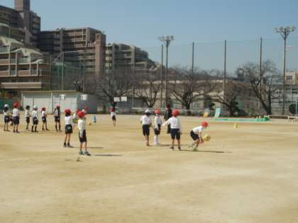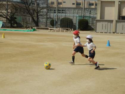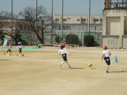 サッカーの練習です。友達とパスをしながらコーンを回ります。