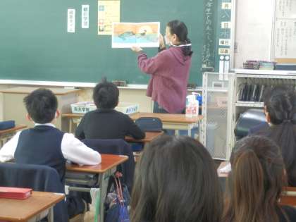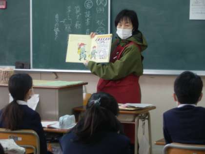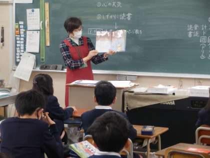 水曜日の朝は、全校で読書を行います。今日は5年生と4年生に本の読み聞かせに来てくださいました。