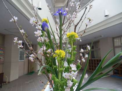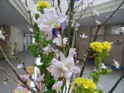 校舎のピロティには、桜の花が生けてあります。春の訪れを感じ心が和みます。