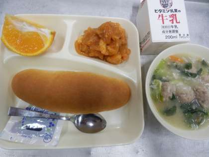 今日の給食は、えびのチリソースいため、中華がゆ、デコポン、コッペパン、牛乳です。「中華がゆの作り方」 米を多めの水でやわらかく煮た料理を「かゆ」と言い、中華がゆは、味のついたスープで米を煮て作ります。給食の中華がゆは、米のほかに、肉団子、だいこん、チンゲン菜、ニンジン、しいたけを加えます。塩、うすくちしょうゆ、チキンブイヨンで味つけし、仕上げにごま油で風味をつけています。