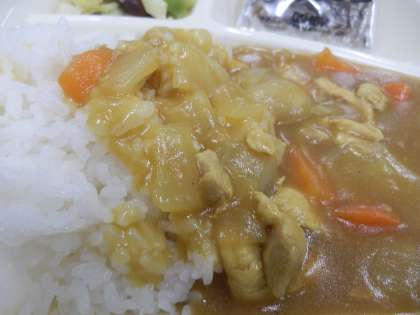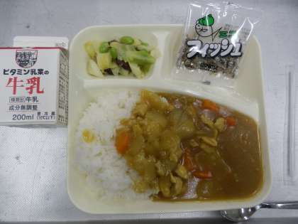 今日の給食は、チキンカレーライス、ビーンズサラダ、ミニフィッシュ、牛乳です。「感謝の心で食事しよう!」私たちの体は食べ物によってつくられ、食事ができあがるまでには、たくさんの人が関わっています。動物や植物の命をいただいていることに感謝して、食べ物を大切にしましょう。