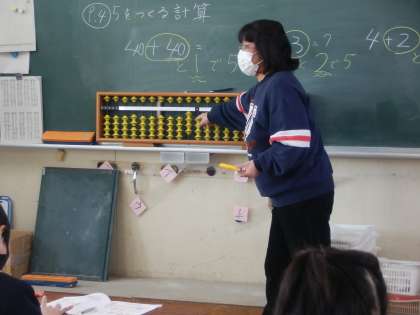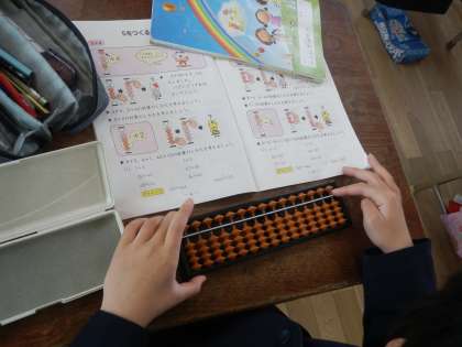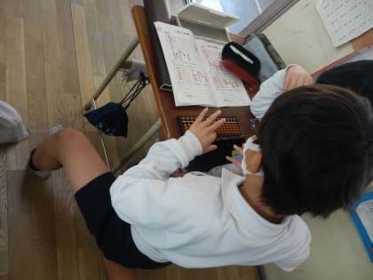 そろばんを使って計算に挑戦だ!そろばんを習っている児童が教えてあげるほほえましい姿が見られました。