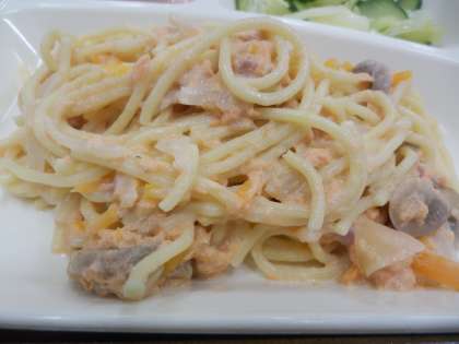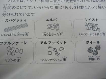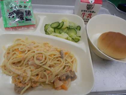 今日の給食は、さけのクリームスパゲッティ、キャベツときゅうりのサラダ、ソフト黒豆、1/2黒糖パン、牛乳です。パスタには、イタリア料理に使う小麦粉から作っためんの仲間のことです。いろいろな形があり、料理によって使い分けられています。給食に使用するパスタの種類には以下のようなものがあります。