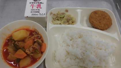 今日の給食は、チキンレバーカツ、ケチャップ煮、ツナとキャベツのバジルソテー、ごはん、牛乳です。バジルは、しその仲間で、あまい香りがします。トマトと組み合わせて、イタリア料理によく使われます。生で、パスタのソースに使ったり、乾燥させてスープやトマトソースに入れたりします。今日の給食では、「ツナとキャベツのバジルソテー」に乾燥バジルを使っています。