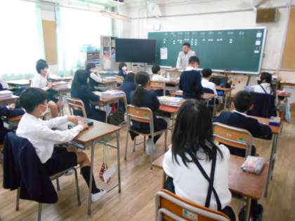 1組では新しく来られた外国語の先生とともに英語の勉強をしていました。2組では学級の係活動や委員会活動などの役割を決めていました。