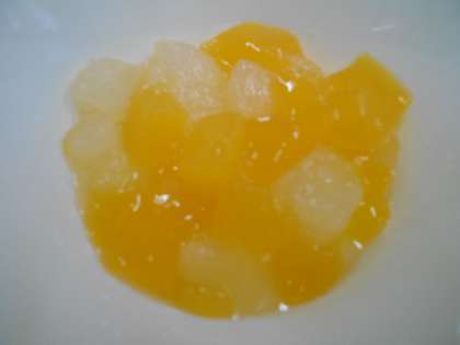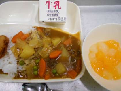 今日の給食は、カツカレーライス、フルーツゼリー、牛乳です。