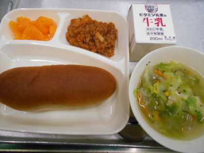 今日の給食は、じゃがいものミートグラタン、レタスのスープ、みかんのかんづめ、黒糖パン、牛乳です。グラタンはフランスで生まれたといわれ、オーブンに入れて焼き色をつけた料理です。グラタンの意味はフランス語で、焼くことでできたうすい皮やこげ目を表しています。今日の給食では、牛ひき肉や豚ひき肉、じゃがいもなどを使ったケチャップ味のミートグラタンが登場します。