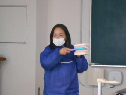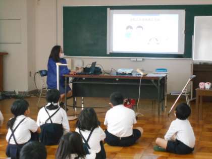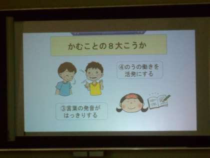 発育測定の前に、保健室の先生から嚙むことの大切さや歯を大事にすることについてお話がありました。しっかり噛むことで、脳の働きをよくすることや、胃腸の働きも良くすることも学びました。