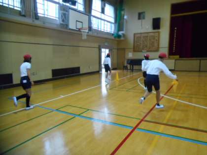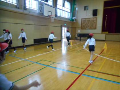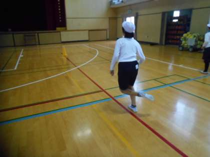 リズムジャンプに挑戦! 軽快な音楽に合わせて片足で跳んだりジグザグに跳んだりいろいろな動きをします。
