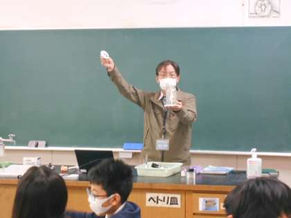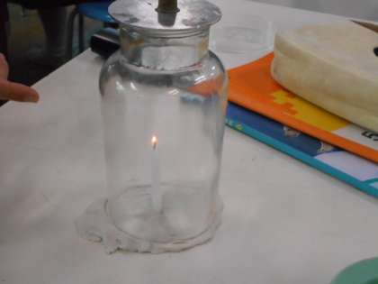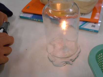 今日の学習は「ものの燃え方と空気の動き」です。平らにした粘土にろうそくを立てて火をつけ、底のないビンをかぶせます。その後、底の粘土を少し取り外します。線香に火をつけその煙で、空気の動きを観察します。空気が入れかわって、新しい空気にふれることで、ものはよく燃えることがわかりました。