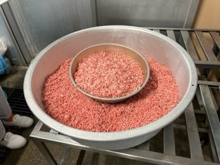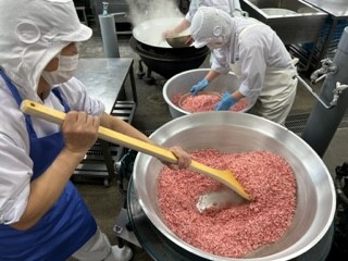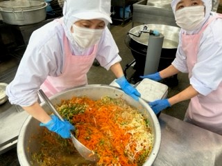 今日の給食「ビビンバ」で使用するミンチ肉です。すごい量ですね。これを全部、火で炒めるのも大変な作業です。ありがとうございます。