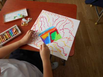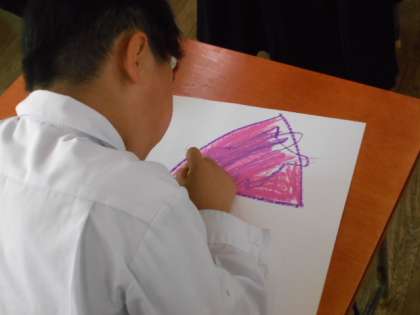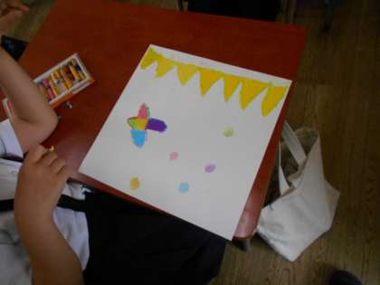 今日の図画工作は「おしゃれハンカチ」です。デザインを考えて、パスで絵を描きます。どんな素敵なハンカチができるかな!?