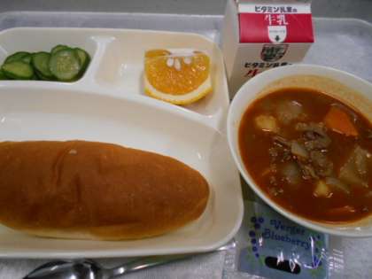 今日の給食は、ビーフシチュー、きゅうりのサラダ、あまなつかん、ブルーベリージャム、コッペパン、牛乳です。あまなつかんは夏みかんから生まれました。さわやかで甘酸っぱい味がします。かぜを防ぐビタミンが多く含まれています。