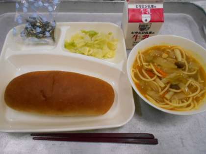 今日の給食は、カレースープスパゲッティ、キャベツのピクルス、ミニフィッシュ、黒糖パン、牛乳です。キャベツの美味しい季節(旬)