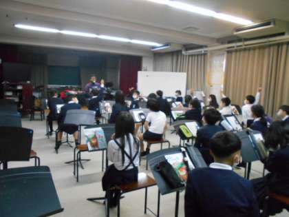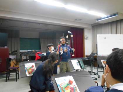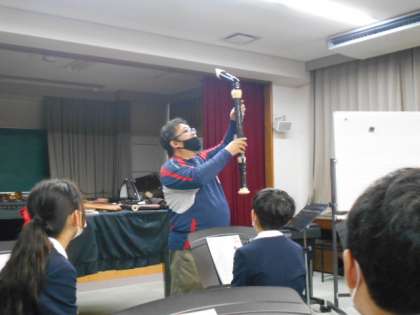 5年生の音楽の時間には、ソプラノリコーダーからバスリコーダーまでのいろいろなリコーダーを先生が紹介してくれました。「全然音が違う」「指が届くかな!?」などさまざまな声が聞こえました。