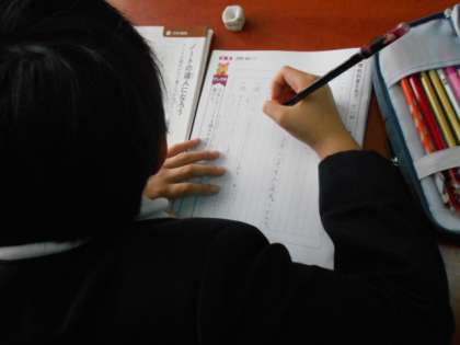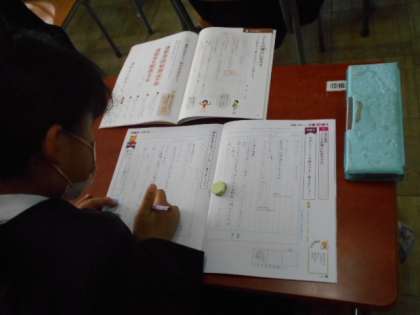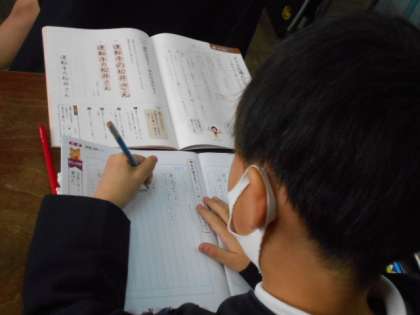 4年生はお手本を見ながら、心を落ち着かせて書写の時間です。