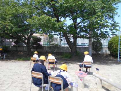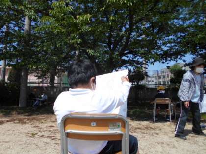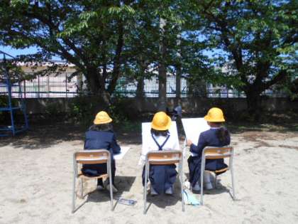 お外で木の写生をしたよ!今日は気持ちのいい青空で力いっぱい画用紙に描きました。