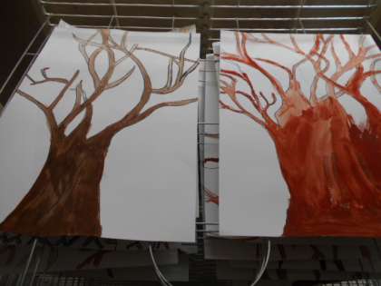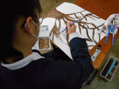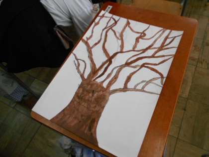 先日、校庭の木を写生したものに、絵具で色を塗りました。色のグラデーションを意識して塗りました。